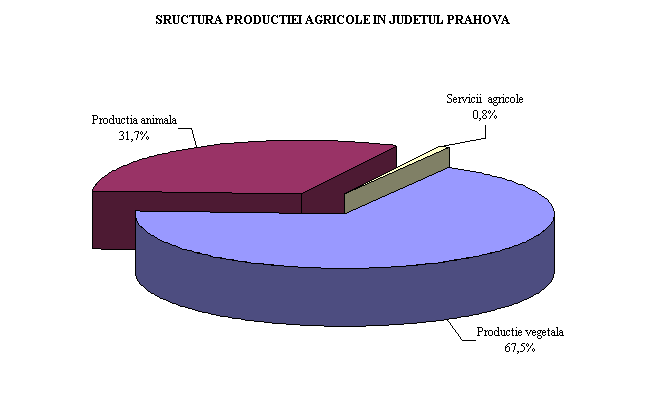 Suprafata cultivata este de circa 145 mii hectare, ponderea populatiei rurale in totalul populatiei este de 49,1% peste media pe tara, iar din numarul de 288,8 mii persoane cat reprezinta populatia ocupata, peste 70 mii persoane lucreaza in agricultura[2]. Agricultura judetului Prahova se caracterizeaza prin cultivarea cerealelor si plantelor uleioase si cresterea animalelor, suprafata agricola reprezentand 58,5% din suprafata totala a judetului. In structura productiei agricole a judetului, ponderea o detine productia vegetala, ce reprezinta 67,5% din total, productia animala si serviciile agricole fiind de 31,7% si respectiv 0,8% din total (graficul nr.2). In ceea ce priveste suprafata agricola pe categorii de folosinta, suprafata arabila reprezinta 52,6% din total, pasunile si fanetele 39,6%, viile si pepinierele viticole 3,2%, iar livezile si pepinierele pomicole 4,8%.