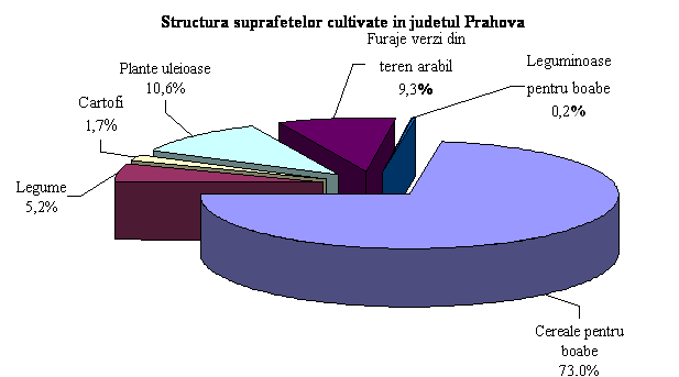 In structura suprafetei cultivate (graficul nr. 3) predominante sunt culturile cerealiere (73% din suprafata cultivata) urmate de plante uleioase (10,6%), productia de furaje verzi (9,3%) si legume (5,2%).