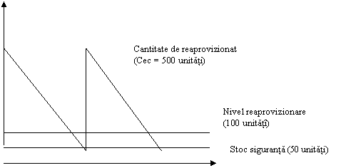 De exemplu, daca Tc = 5 zile, Rf 10 unitati pe zi si Ss 50 unitati iar Cec 500, atunci NR = (5 * 10) + 50 = 100 unitati. Astfel, se vor comanda alte 500 unitati de stoc, atunci cand stocul coboara la 100 unitati. In fig. 4 este prezentat nivelul de reaprovizionare pentru exemplul acestei mici afaceri.