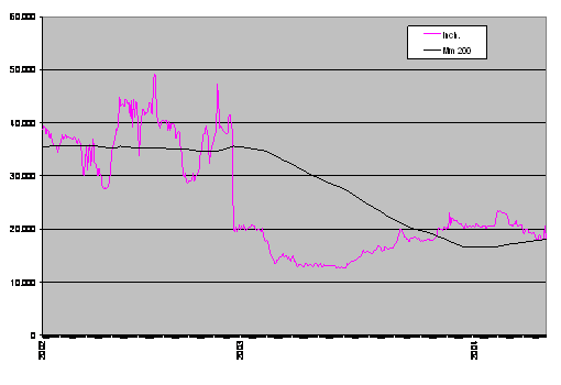 In schimb, investitorii care au cumparat actiunile in prima zi de cotare la bursa au obtinut randamentul -0,17, cursul scazand in aceasta perioada cu 30.340,92 de unitati (s-a luat in calcul distribuirea unei actiuni noi pentru fiecare actiune detinuta cu ocazia majorarii capitalului social in luna decembrie 2002, a carei valoare in calcul, C', a fost considerata cursul mediu al actiunii in ziua majorarii capitalului social).