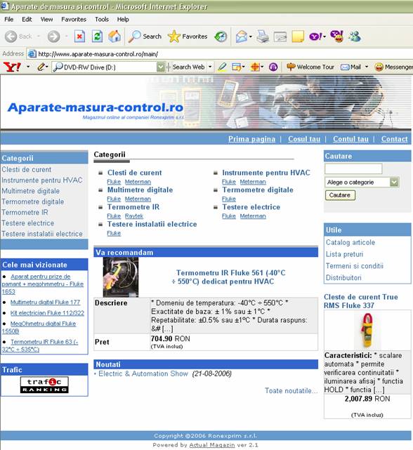 a. Magazinul electronic al firmei Ronexprim. Firma ofera aparate variate de masura si control. Site-ul include si lista de distribuitori din tara. Plata se poate face online cu card sau prin transfer bancar.
