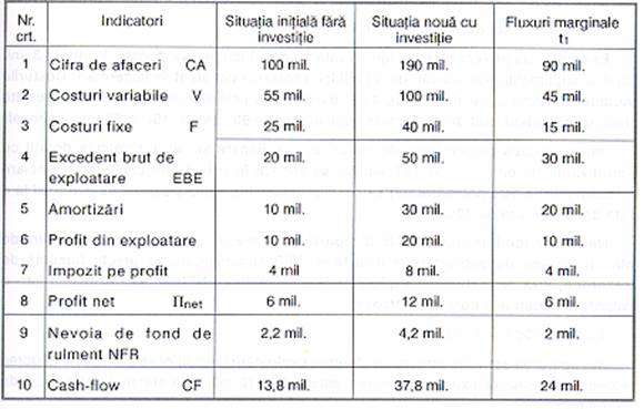 Exemplu: Un proiect de investitii, in valoare de 60 mil. lei, va degaja, in viitorii 3 ani, un flux suplimentar de vanzari de 90 mil.lei, presupus constant in fiecare an. Costurile variabile de exploatare aferente sunt de 45 mil. lei, iar cele fixe sunt de 15 mil.lei. Rezulta deci, un excedent brut de exploatare suplimentar de 90 - (45 + 15) = 30 mil. lei anual.