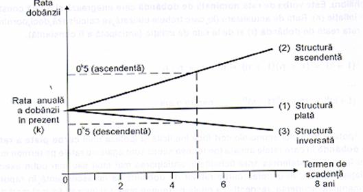 Ipoteza mediului economic cert face implicita si ipoteza unei curbe plate a ratelor de dobanda, in care ratele anuale (pe termen scurt) sunt egale cu ratele pe termen mediu sau lung. Ori, preferinta spre lichiditate, anticiparea mai mult sau mai putin exacta a inflatiei face ca, in general, curba ratelor de dobanda sa fie ascendenta in raport cu termenul de scadenta, respectiv ca ratele pe termen mediu si lung sa fie mai mari decat cele anuale (pe termen scurt). O panta accentuat ascendenta prefigureaza si o crestere a ratelor anuale in perioada viitoare. Dimpotriva, o panta descendenta, denumita si structura de rate inversata (rate pe termen scurt > rate pe termen lung), prefigureaza o scadere a ratei inflatiei si,deci,a ratelor (nominale) de dobanda pe termen scurt.