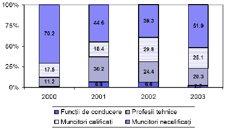 Ponderea intreprinderilor infiintate de fosti muncitori necalificati, dupa ce a urmat o evolutie negativa, creste, atingand pragul de 51,9% in anul 2003. In schimb, scade mult numarul intreprinzatorilor ce au avut, fie functii de conducere sau profesii tehnice, fie au lucrat ca muncitori calificati. Aceasta crestere poate fi pusa si pe seama programelor de orientare antreprenoriala a celor care fiind disponibilizati din intreprinderile de stat in restructurare au beneficiat de pachete compensatorii si de sprijin si indrumare corespunzatoare, prin programe guvernamentale, pentru deschiderea unei afaceri.