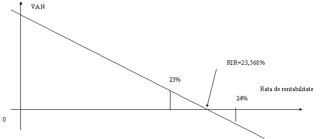 Pe intevalul de variatie a ratelor de rentabilitate de 23% si 24 % , curba VAN se considera a fi o dreapta , iar , prin interpolare liniara , se determina RIR ( a se vedea fig. nr. 12.3.)