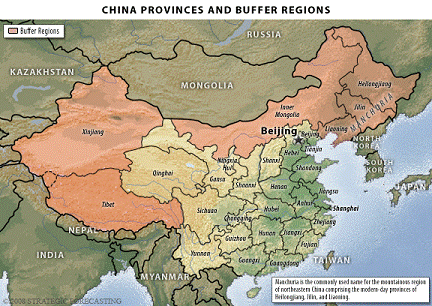 An area of non-Han regions surround this heartland - Tibet, Xinjiang province (home of the Muslim Uighurs), Inner Mongolia and what is commonly referred as Manchuria (a historical name given to the region north of North Korea that now consists of the Chinese provinces of Heilongjiang, Jilin and Liaoning). These are the buffer regions that historically have been under Chinese rule when China was strong and have broken away when China was weak. Today, there is a great deal of Han settlement in these regions, a cause of friction, but today Han China is strong.