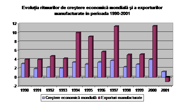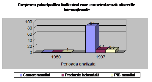 Aceste rezultate arata ca, tot mai mult din activitatea realizata in cadrul spatiului national este destinata spatiului extern, situatie diametral opusa secolului precedent, spre exemplu, cand cele mai multe dintre bunurile consumate erau produse in interiorul respectivei tari. Principala caracteristica a afacerilor derulate la inceputul mileniului al treilea, valabila pentru orice domeniu de activitate economic sau non-economic, o reprezinta, deci, orientarea activitatii intreprinderii catre noi piete externe. In graficele urmatoare sunt prezentate: evolutia comparativa dintre comertul mondial, productia industriala si produsul intern brut mondial intre anii 1950-1997, precum si diferenta inregistrata intre ritmurile de crestere ale exporturilor de bunuri manufacturate mondiale si ale cresterii economice mondiale intre 1990-2001.