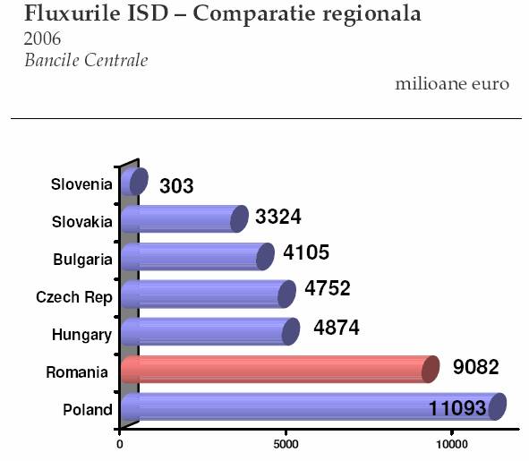 Romania ocupa locul cinci in regiunea Europei Centrale si de Est in ceea ce priveste volumul total al investitiilor externe directe realizate. Cu toate acestea, indicatorul privind investitiile externe directe pe locuitor este sub nivelul multor tari din regiunea Europei Centrale si de Est.