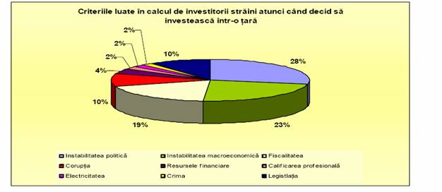 In raportul Bancii Mondiale "World Development Report" pe 2005 se arata ca societatile transnationale decid sa investeasca intr-o tara dupa analize foarte atente, pornind de la criterii precise: incertitudinea politica, instabilitatea macroeconomica, legislatia, nivelul taxelor, coruptia etc. Graficul 4.1
