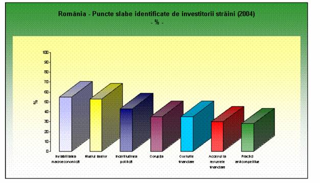 Pentru Romania sunt identificate urmatoarele puncte nevralgice: instabilitate macroeconomica, nivel ridicat al taxelor, incertitudine politica, nivel ridicat al coruptiei, costuri financiare sporite etc.