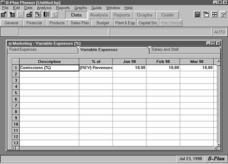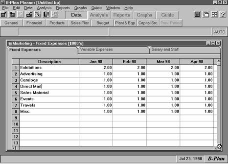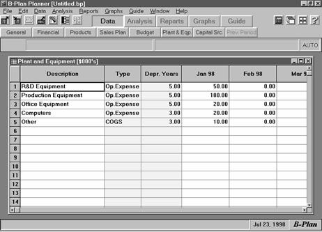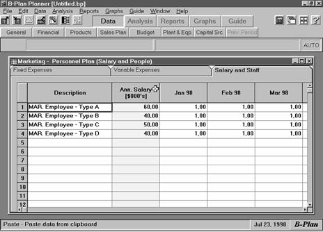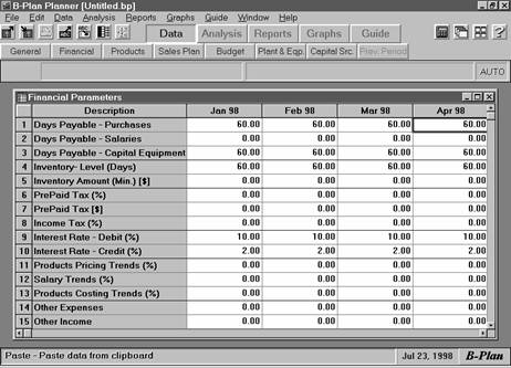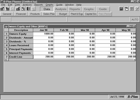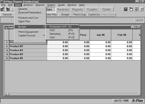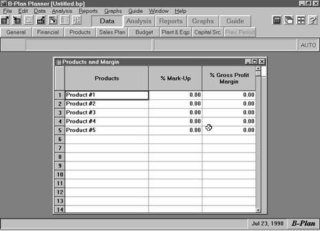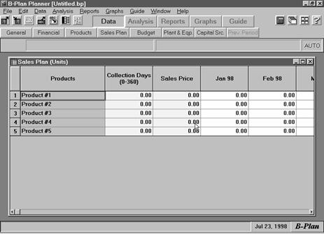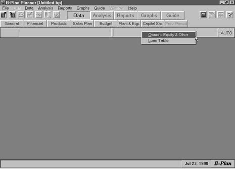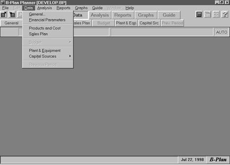 Utilizati optiunile meniului Data pentru a introduce informatii despre afacere si despre planul de afaceri.