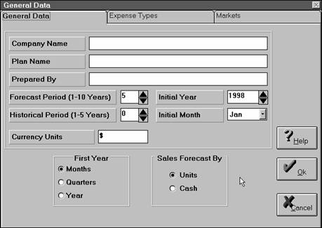 Din meniul Data selectati General pentru a introduce urmatoarele informatii despre afacerea Dvs. si despre plan:
