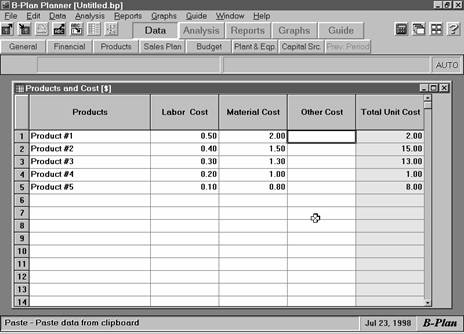 Daca selectati Units, fereastra Unit Cost & Price va permite introducerea datelor referitoare la costuri si preturi pentru fiecare produs sau serviciu, iar planul de vanzari va fi exprimat in numar de unitati.