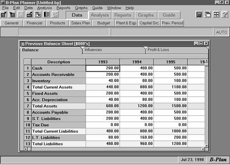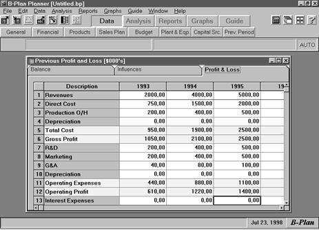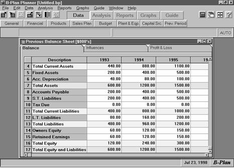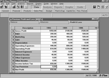 Daca ati specificat un numar de ani pentru care doriti informatii din urma, selectati Previous Period din meniul Data. Introduceti apoi informatiile despre profitul, pierderile si bilantul din anii precedenti. Puteti introduce de asemenea influentele perioadei precedente asupra celei viitoare, cum ar fi rambursarile de imprumuturi.