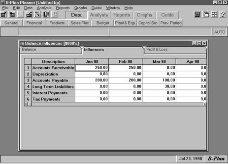 In acelasi fel, valoarea Payables din Previous Balance Sheet este egala cu 500.000 . Valoarea introdusa in linia Payables din fereastra Balance Influences arata cand este datorata valoarea din balanta. In exemplul de mai sus aceasta inseamna ca 200.000 trebuie platiti in prima luna, alti 200.000 in cea de‑a doua luna iar restul sumei trebuie platit in cea de‑a treia luna.