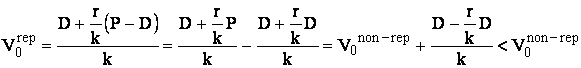 daca r > k, intreprinderea nu va distribui nici un dividend, pentru ca altfel nu ar putea obtine o valoare maximala pentru V0. Intr-adevar, sa presupunem ca firma va decide repartizarea unui dividend (D > 0). In aceste conditii valoarea actuala a firmei (V0rep) devine, comparativ cu valoarea unei firme ce reinvesteste profitul (V0non-rep):