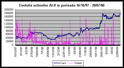 Grafic 1.3.2. Evolutia cursului si a volumului de actiuni Alro in perioada 1997-2000
