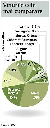 "Oamenii pun accent in primul rand pe pret. Calitatea nu prea conteaza. De aceea, cel mai bine vandute raman vinurile obtinute in gospodariile micilor producatori", a spus Namolosanu. Potrivit unui studiu facut de ONVV, 32% dintre romani prefera vinul de slaba calitate, 27% se indreapta catre cel superior si 29% aleg vin DOC, in timp ce 12% nu cunosc diferenta dintre aceste vinuri. "De fapt este posibil ca, in realitate, cei care nu cunosc acest mod normal de clasificare a vinurilor sa fie mult mai multi, dar o parte din ei au presupus ca ordinea raspunsurilor din chestionar este de fapt o ierarhizare si au legat acest lucru probabil de pretul vinului si nu de calitatea lui intrinseca", a explicat seful Oficiului.