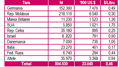 Exportul de vin, principalele destinatii pentru anul 2002 :