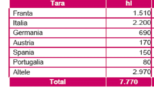 cantitativ, Romania avea un export de vin de 253 mii hl in 2000, a atins un maxim de 504 mii hl in 2002, pentru ca sa scada din nou in 2005, pana la 269 mii hl.