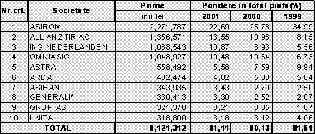 Topul primelor 10 societati de asigurare din Romania pentru anii 1999-2000-2001[12]