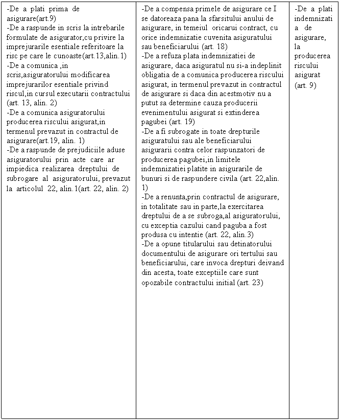 Legea 136/1995 prezinta drepturile si obligatiile partilor contractului de asigurare,formulate expres.Acestea sunt: