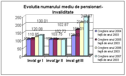 In cazul pensiei de invaliditate s-au inregistrat cresteri majore la gradul III de handicap , gradul II avand o evolutie oarecum constanta situatia este prezentata in graficul urmator: