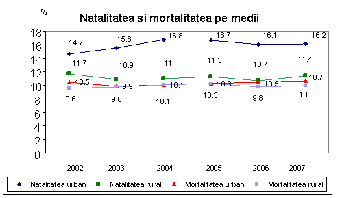 Se poate observa o crestere mai mare a natalitatii in mediul urban fata de cel rural, si o mentinere in aceleasi proportii a mortalitatii in ambele medii, diferentele fiind mici in comparatie cu procentele din cadrul natalitatii in ambele medii.