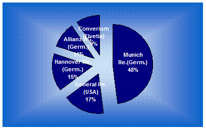 Din tabelul 2. si figura 1. se poate vedea cum clasamentul este dominat de societatile din Germania, din cinci societati 3 sunt germane, una din SUA si una din Elvetia. Societatea Munich Re. este o societate cu traditie pe piata germana si a avut subscrieri aproape de trei ori mai mari decat celelalte societati. General Re. si Hannover Re. sunt la o diferenta foarte mica una de cealalta.