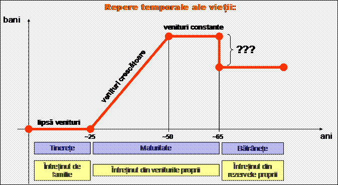 Viata oricarui om poate fi descrisa printr-un grafic asemanator celui de mai sus. Practic, este vorba de anumite etape in viata fiecaruia, etape definite de modurile de procurare a resurselor necesare vietii, resurse care in conjunctura actuala a societatii umane se refera in principal la resursele financiare.