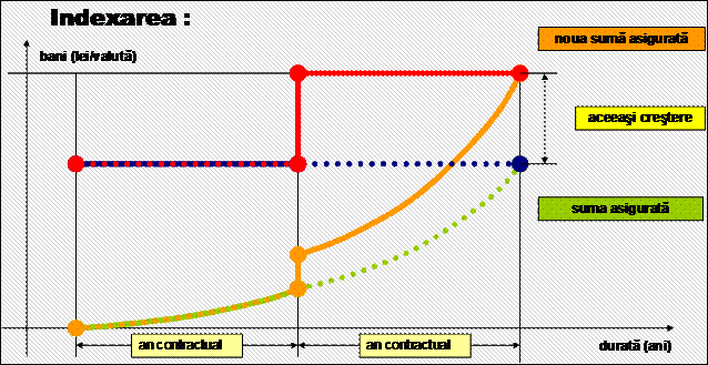 Indexarea contractelor in LEI Pentru asigurarile incheiate in LEI care au convenita indexarea, sumele de asigurare se indexeaza (se majoreaza) cu cel putin 5% pe an.