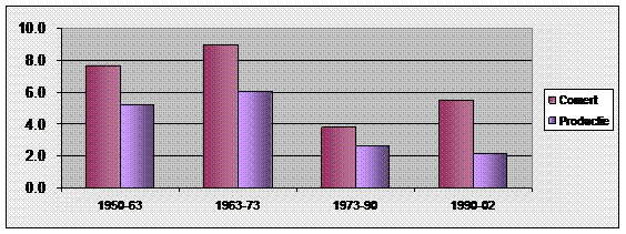 In anul 1990, fata de 1950, produsul intern brut a crescut pe plan mondial de peste 6 ori, productia industriala globala de peste 7 ori, fata de o crestere a comertului mondial de circa 56 ori.