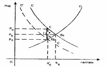 In figura numarul 8 se poate observa ca inaintea introducerii impozitului, pretul de echilibru se poate realiza pentru o cantitate qE , in punctul Eq, de intersectie a curbei cererii cu curba ofertei. Prin introducerea impozitului indirect (taxei de consumatie) pretul pentru consumator creste, ceea ce face sa se reduca cererea, curba cererii devenind C`. Noua curba a cererii va intersecta curba ofertei intr-un alt punct E`q`, care va fi noul punct de echilibru, in conditiile unei cantitati (q`E) mai mici ca cea initiala. Acestui punct de echilibru (E`q) ii corespunde un nou pret (de echilibru) Pp, ce revine producatorului, mai redus ca cel initial (Pp<PE), in timp ce pretul platit de consumator (Pc) va fi dat de punctul E, de intersectie a dreptei q`EE (care reprezinta cantitatea ce asigura noul echilibru) cu curba cererii initiale (C) si va fi egal cu pretul producatorului plus impozitul Pc=Pp+I ;