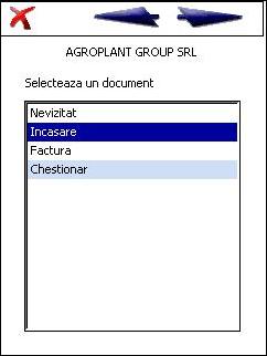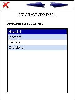 - Vizita client cuprinde lista clientilor apartinand codului de agent setat (cu detaliile specifice pentru fiecare client in parte) si sub-meniurile Nevizitat, Incasare, Factura si Chestionar