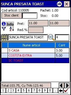 Cantitatile dorite se introduc, in dreptul fiecarui produs, cu ajutorul tastaturii numerice din josul ecranului si se valideaza prin apasarea bifei din partea dreapta jos.