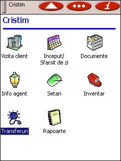 Meniul Transferuri permite utilizatorului sa realizeze sincronizarea dispozitivului mobil cu serverul dedicat din back-office pentru realizarea transferului de informatii.