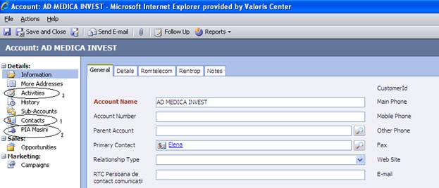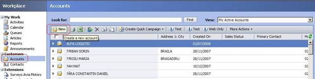 Pentru clientii care au achizitionate masinile pe societate, primul pas este cautarea inregistrarii, accesand campul "Accounts". In campul "Look for": sa va introduce denumirea societatii. In cazul in care societatea cautata nu este inregistrata in baza noastra de date, vom crea Account-ul accesand butonul "New", inregistram numele societatii si dam SAVE .
