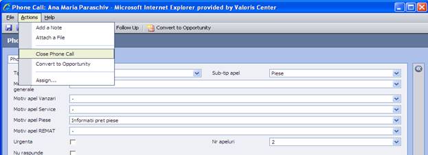 in cazul in care avem o rezolutie finala pentru clientul respectiv, Phone Call-ul se inchide folosind meniul Actions / Close Phone Call / Se va deschide o noua fereastra in care la Status selectam RECEIVED si OK.