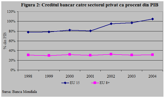 Dupa cum se poate observa din figura de mai sus, in UE 15 (cei 15 membrii fondatori ai Uniunii Europene) exista o finantare consistenta a sectorului privat din credite bancare raportat la PIB, fata de tarile UE 8 si de Romania. Exact aceasta discrepanta ofera factoringului posibilitati de crestere si extindere.