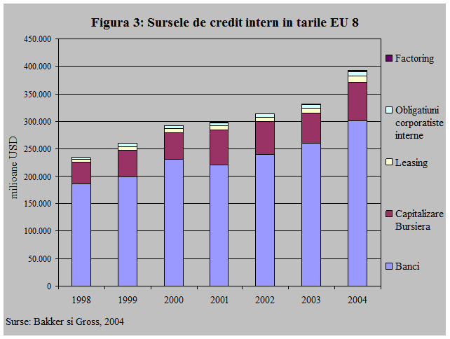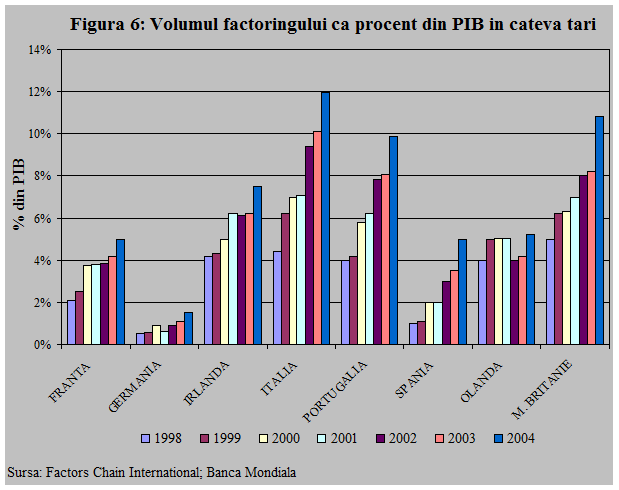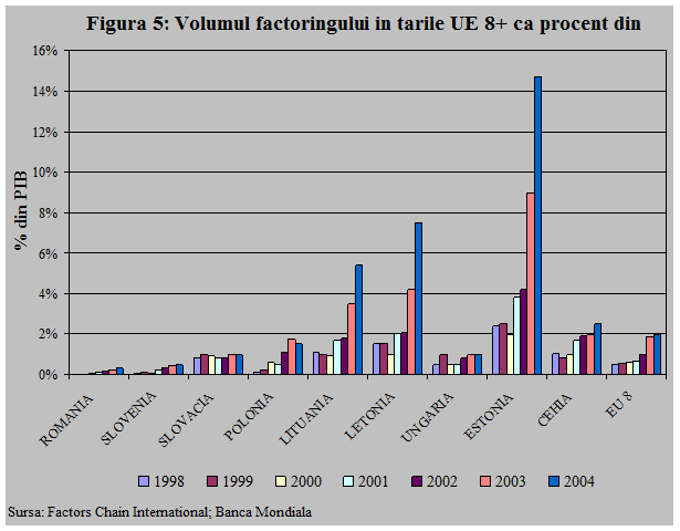 Figura de mai sus permite o privire mai detaliata asupra celor opt state europene, din punct de vedere al finantarii domeniului privat (pentru Romania nu au fost disponibile date, dar, asa cum se va vedea pe parcursul lucrarii, se pot face asemanari cu evolutiile tarilor din UE 8). Desi pietele de capital joaca un rol semnificativ, este evident faptul ca in cele opt tari europene sistemul este orientat catre zona financiar-bancara. Finantarea intermediata domina piata de capital chiar si in ceea ce priveste firmele mari si cum creditul bancar nu este suficient, factoringul poate reprezenta o sursa alternativa foarte eficienta.
