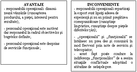 Aceasta structura poate sa contribuie semnificativ la dezvoltarea activitatii internationale a intreprinderii. Personalul operational cuprinde: comerciantii, inginerii (in functie de complexitatea produselor), responsabilii, care raspund adesea de o zona geografica formata din mai multe tari cu caracteristici comparabile.