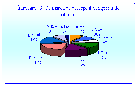 Cu ajutorul a 120 chestionare, completate la 4 blocuri alese aleator, din Municipiul Bucuresti se incearca o cuprindere cat mai mare a fenomenului de determinare a preferintelor obiceiurilor de cumparare a detergentilor de rufe