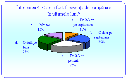 Din punct de vedere al locului de achizitie, cei mai multi 65% prefera sa cumpere din magazine mari, gen hypermarket, supermarket, unde pretul este mai mic si exista o gama mai larga de produse.