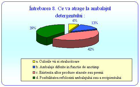 Prezenta intrebare confirma veridicitatea argumentelor de la intrebarea anterioara, astfelcel mai important criteriu in aleg4erea unui detergent il constituie - pretul -42,86% urmate de partea calitativa a produsului - cu 39,29% in timp ce ambalajul se pare ca nu influenteaza prea mult (doar 18%).