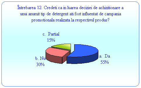 Intrebarea 12. Credeti ca in luarea deciziei de achizitionare a unui anumit tip de detergent ati fost influentat de campania promotionala realizata la respectivul produs?