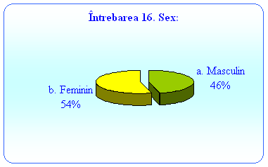 In ceea ce priveste sexul, 54% dintre cei ce au completat chestionarul sunt femei in timp ce numai 46% sunt de sex masculin.