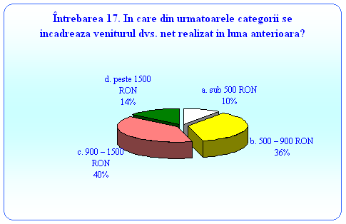 Intrebarea 17. In care din urmatoarele categorii se incadreaza veniturul dvs. net realizat in luna anterioara?