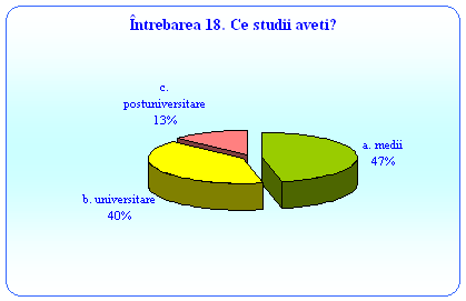 Ca studii majoritatea intervievatilor au o au studii superioare - 53%, din care 13% cu studii postuniversitare, in timp ce persoanele cu studii medii au un procent de 47%.