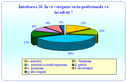 Desi majoritatea chestionatilor au studii superioare, rezultat aflat dintr-o intrebare precedenta, categoriile socio-profesionale sunt eterogene, procentele fiind destul de apropiate intre ele. Doar 5% au alte ocupatii decat cele prevazute in chestionar.