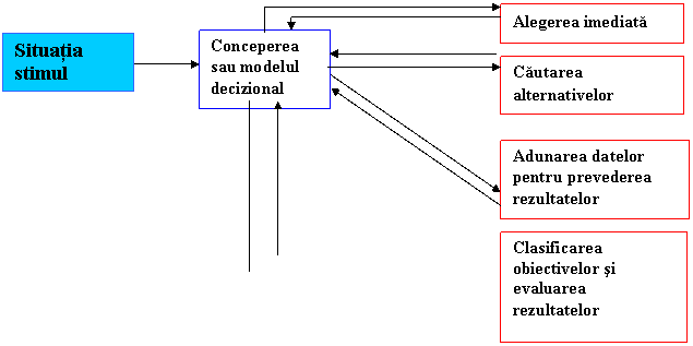 alege una din ele sau formuleaza propria lui varianta. Mecanismul deciziei se poate desfasura dupa una din schemele tip - la intamplare, pe baza de rutina, instruire, paradigme sau folosind metode sistemice. Odata luata, decizia este impusa prin parghii institutional administrative;